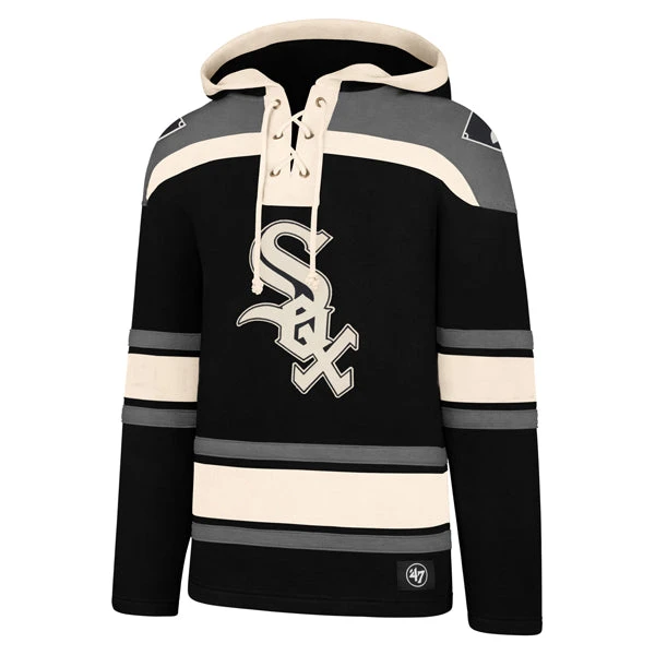 Check out out this Chicago White Sox Black/Grey Current Logo Lacer Hoodie which features a predominantly black body with horizontal cream and gray stripes. It has the Sox logo on the front of this hoosie along with Socks Patches on the shoulders. the hoodie laces up like hockey jersey. If looking forward to sunny summer days at the Guranteed Rate Field aren’t enough to keep you warm this winter, grab this Chicago White Sox sweatshirt to get through the off-season.