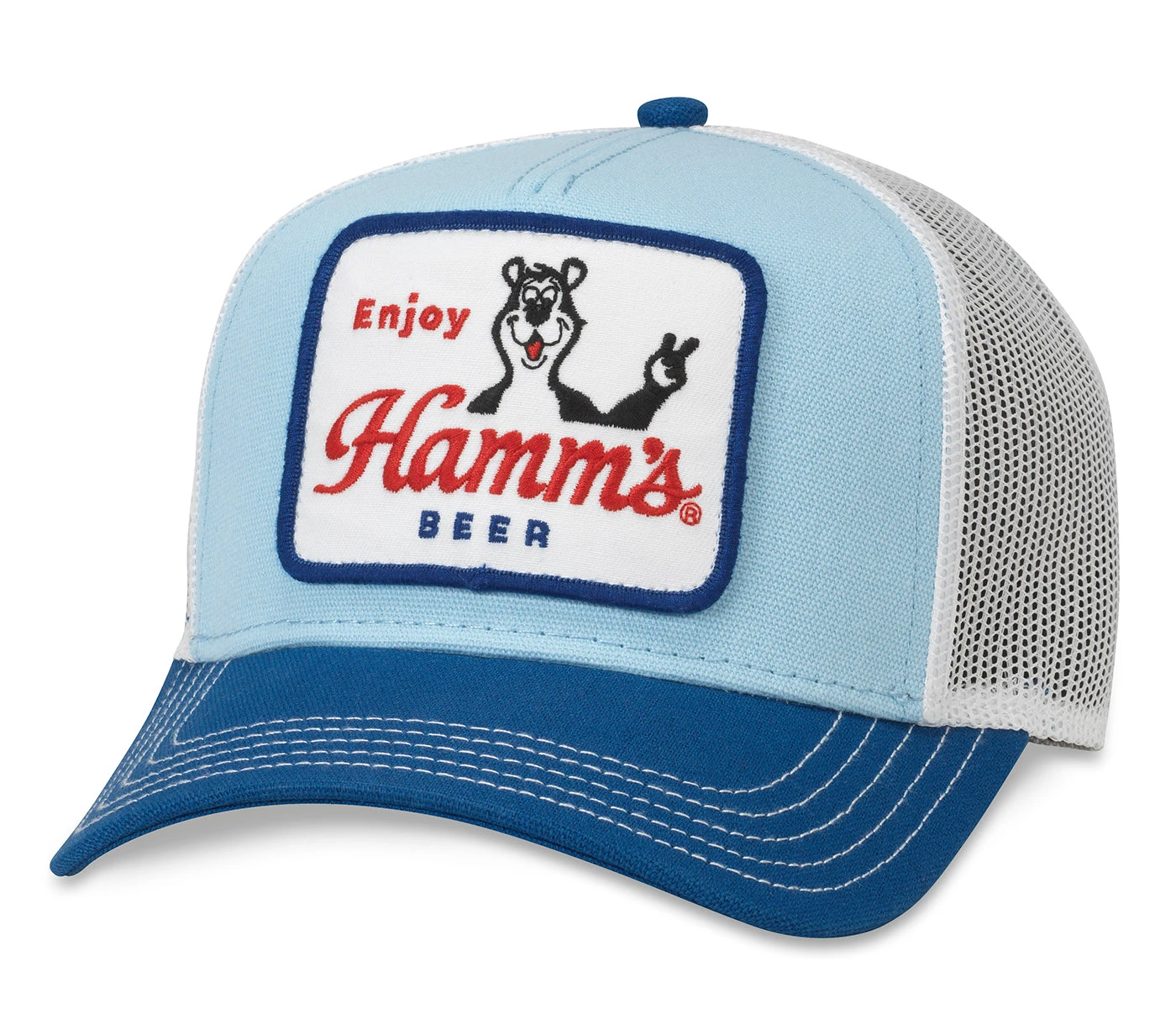 Represent your favorite beer with this Hamm’s Valin Blue Trucker Hat. The friendly mascot is on the front of this cap on the patch. Get yours today at Clark Street Sports!