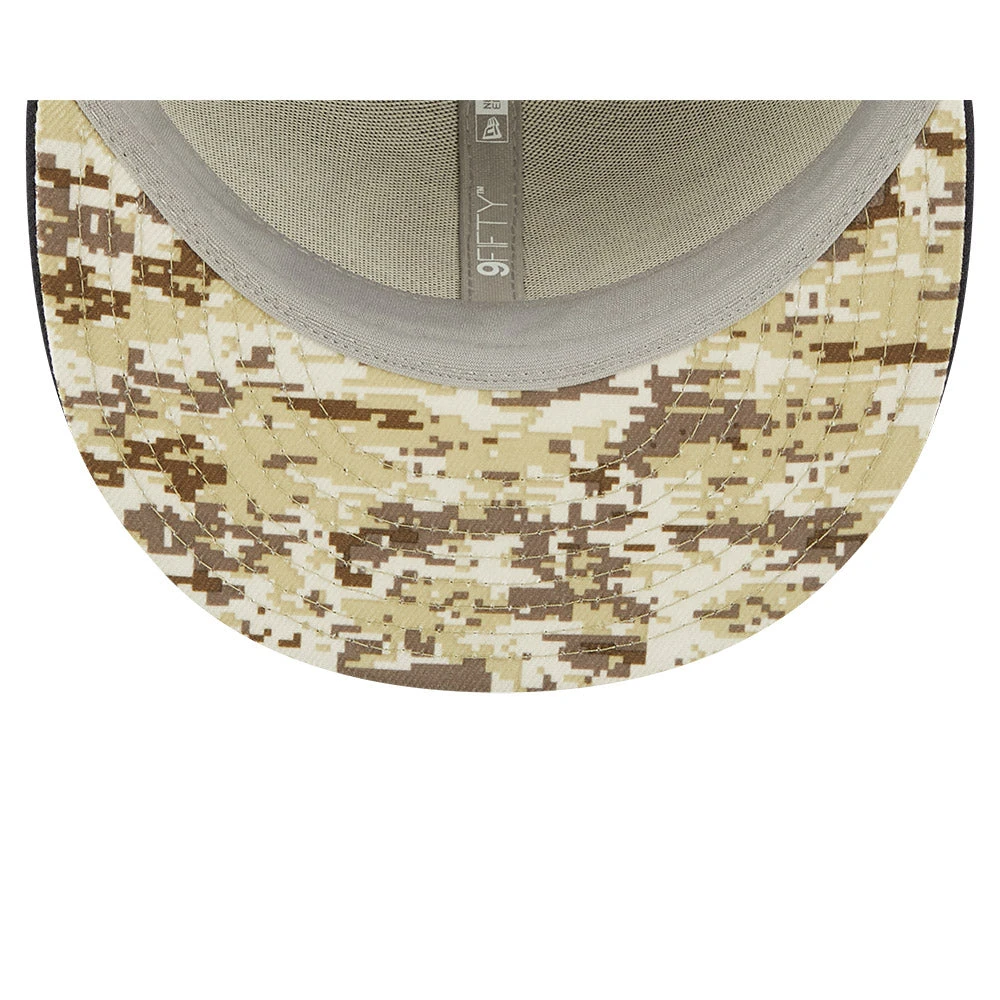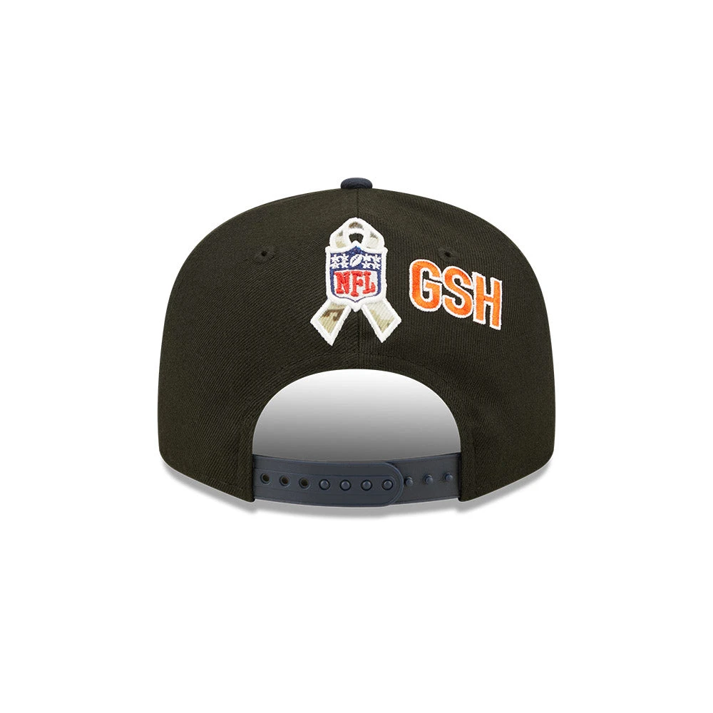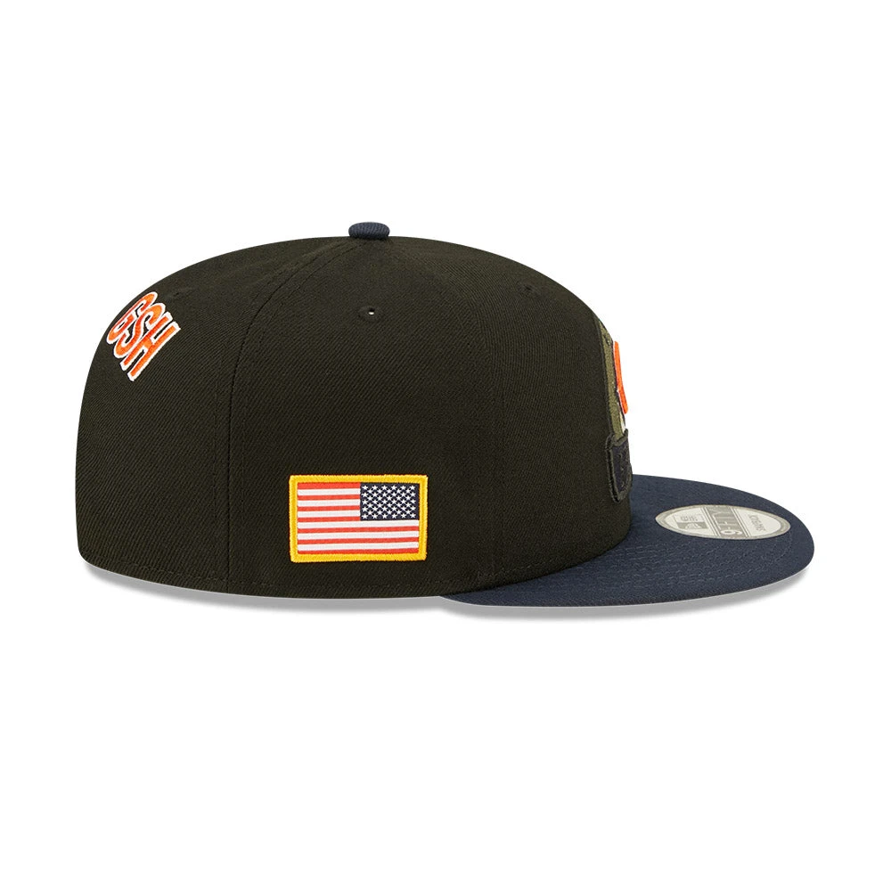 Honor our service members while supporting the Chicago Bears with this 2022 Salute To Service 9FIFTY Snapback Hat by New Era! This snapback hat proudly displays the Chicago Bears logo with camouflage detail behind it, as well as a banner underneath that features the team’s name and year they joined the NFL, 1920. The contrast color undervisor has a camouflage pattern underneath, matching the Salute To Service ribbon embroidered on the rear. A woven tag with an American flag adorns the right side of the hat.