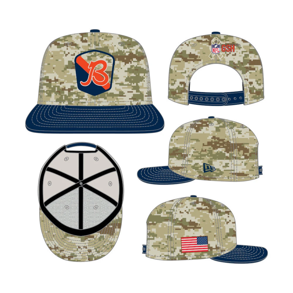 Show your support for the Chicago Bears and our veterans with the limited edition 2023 Salute To Service New Era 9FIFTY Snapback Hat! The hat features a trendy Camo print crown, a rich Navy blue brim, and a U.S patch on the right side. With this hat, you can make a statement and honor those who have served our country. This is On-Field Headwear!