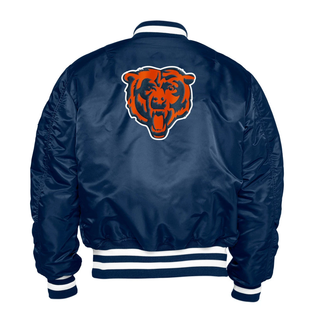 This Chicago Bears Alpha Men’s Satin Jacket is the perfect addition to your fall and winter wardrobe. This bomber jacket features a variety of Chicago Bears patches featuring team logos and patches all throughout the jacket. The back of the jacket features the classic Chicago Bear head logo.