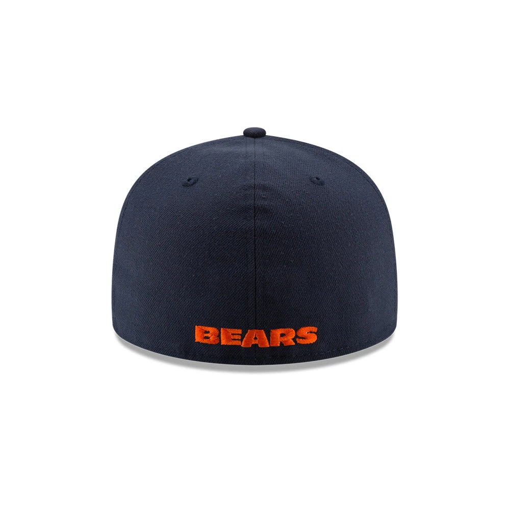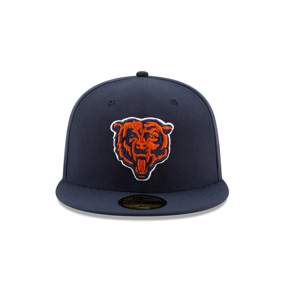 This navy, flat-billed Chicago Bears fitted hat features a raised-embroidered orange, navy, and white Bear Face logo on the front of the structured crown. The side features a New Era logo in orange, and the back has a quaint NFL logo embroidered on it, as well. The NE Tech material helps keep your head cool and wicks away moisture.