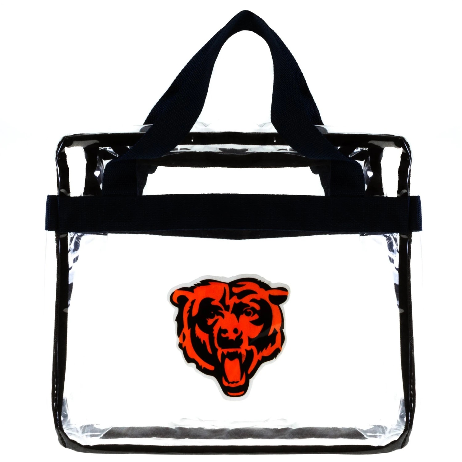 This clear Chicago Bears messenger bag features a printed angry bear face logo on the front, navy handles, and a zipper to secure your belongings. The NFL forbids opaque bags; this clear bag is perfect for taking to Soldier Field on game day. It is made from durable plastic that is sure to last multiple seasons.