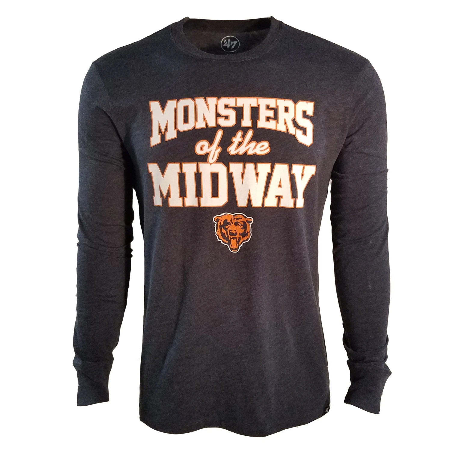 Bear Down and cheer on every Monster of the Midway in this classic Chicago Bears Midway Club long-sleeve shirt. This navy blue long-sleeve Bears T-shirt features “Monsters of the Midway” screen printed on the center chest in a vintage orange and white font. Beneath these fighting words are the classic Bearhead logo. It’s all set against a textured navy blue body that looks great day or night.