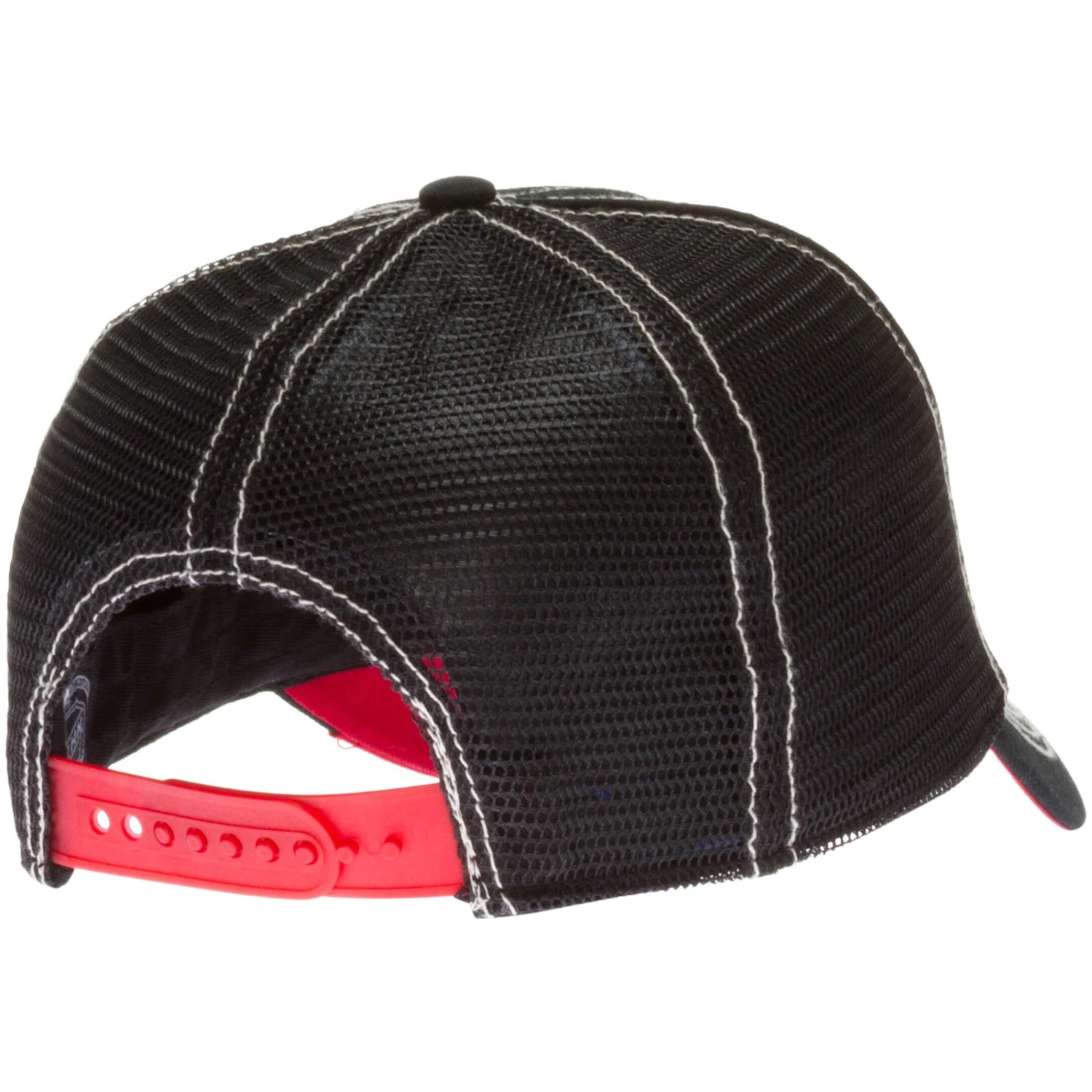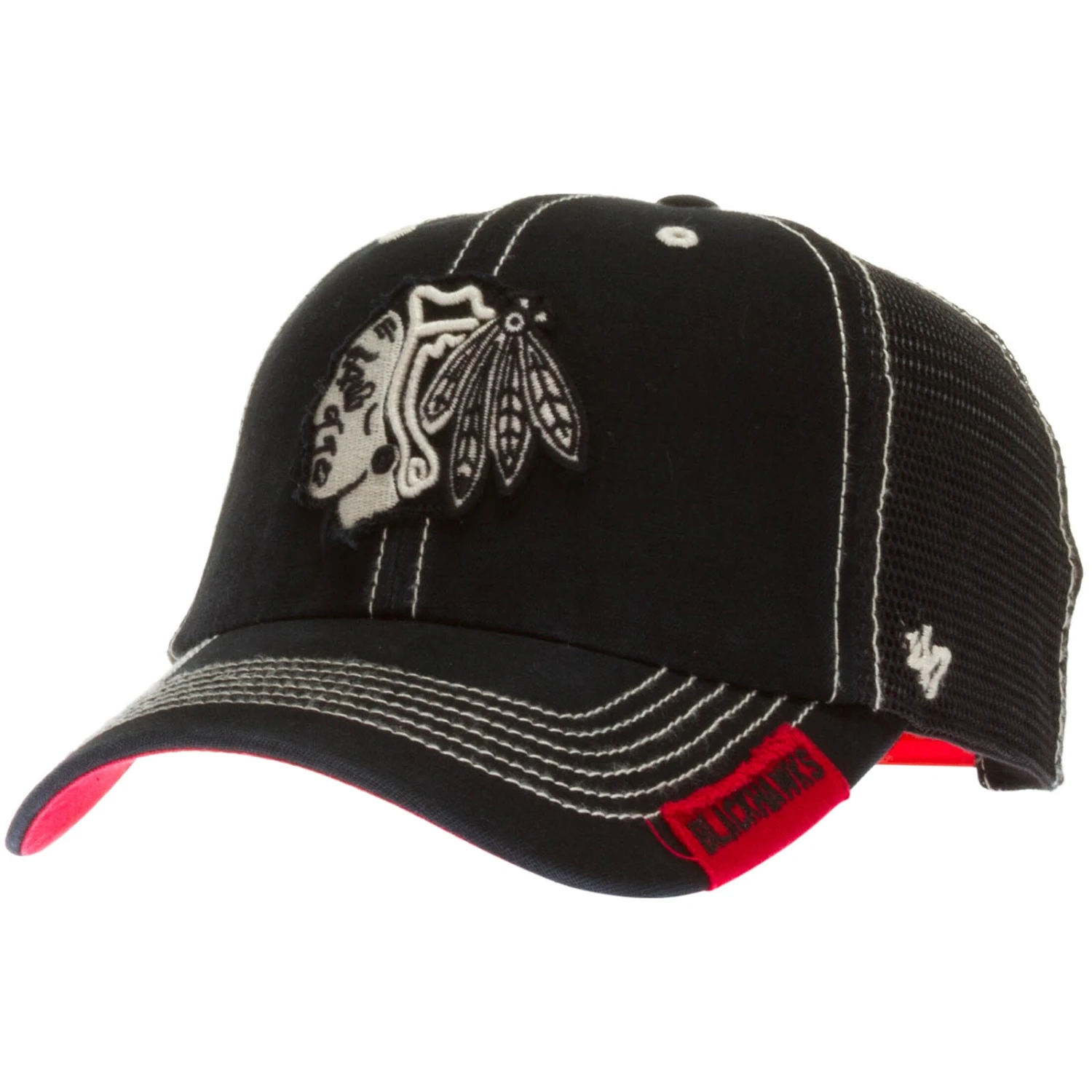 Get ready to head out to the Madhouse on Madison and cheer on the Blackhawks in this great hat. This adjustable hat has a trucker-cap style crown with a black fabric front and a black mesh back; it also had a curved black bill. The Chicago Blackhawks primary Indian head logo is an embroidered black and white patch on the front of the hat with frayed black edges. The two plastic straps on the back adjust and interlock to ensure the hat is always a comfortable fit. When you are suiting up to watch the Blackhawks take down the competition, be sure you are sporting this sharp monochromatic Blackhawks hat.