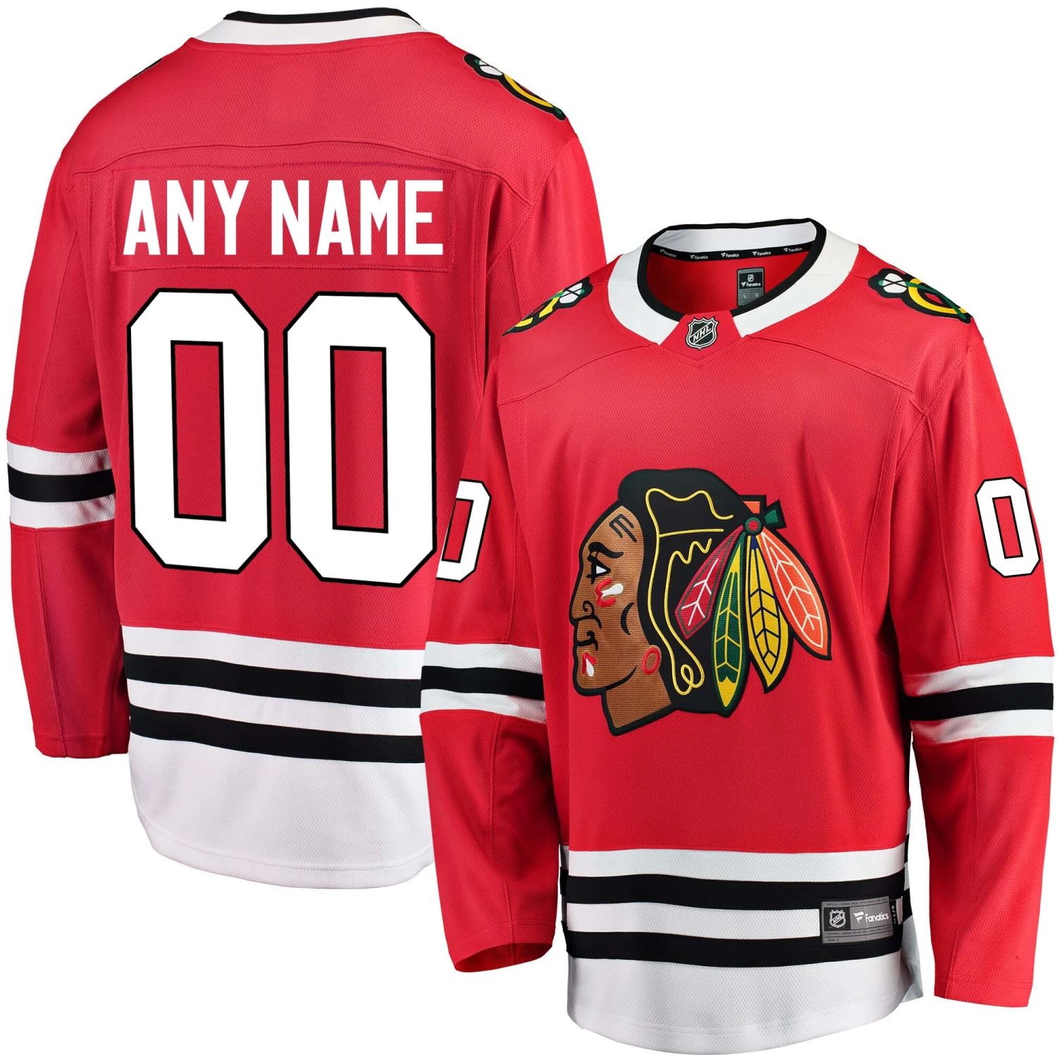 Look like you are headed out to the Madhouse on Madison to help your fellow Blackhawks take down the competition in this red premier Chicago Blackhawks home jersey that is customized with your name and number. The front of this jersey has the team’s iconic primary Indian head logo stitched in reflective full-color. Two secondary reflective stitched tomahawk logo patches are stitched to either shoulder. The back of the jersey boasts a name of your choosing in stitched white lettering against a red jersey fabric block above a number of your choosing, single or double digits, that are made with white and black stitched numerals. This jersey looks just like the one that the Blackhawks wear on home ice, and it has your special name and number on the back. Grab this jersey today and get ready for puck-drop at the United Center.
