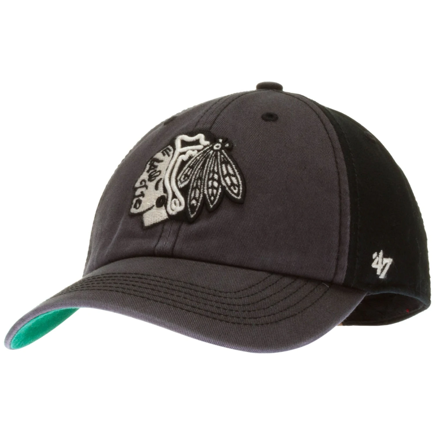 Be your own person in these unique Chicago Blackhawks fitted hats that look like they’re straight out of a silent movie. Instead of team colors, 47 Brand uses charcoal gray and black as the base for their relaxed fit cap. The Indian head logo is embroidered in black and white on the front with white “Chicago Blackhawks” block letters across the back. The Franchise Blackhawks fitted hat is made using recycled plastic bottles that never die just like your team loyalty.