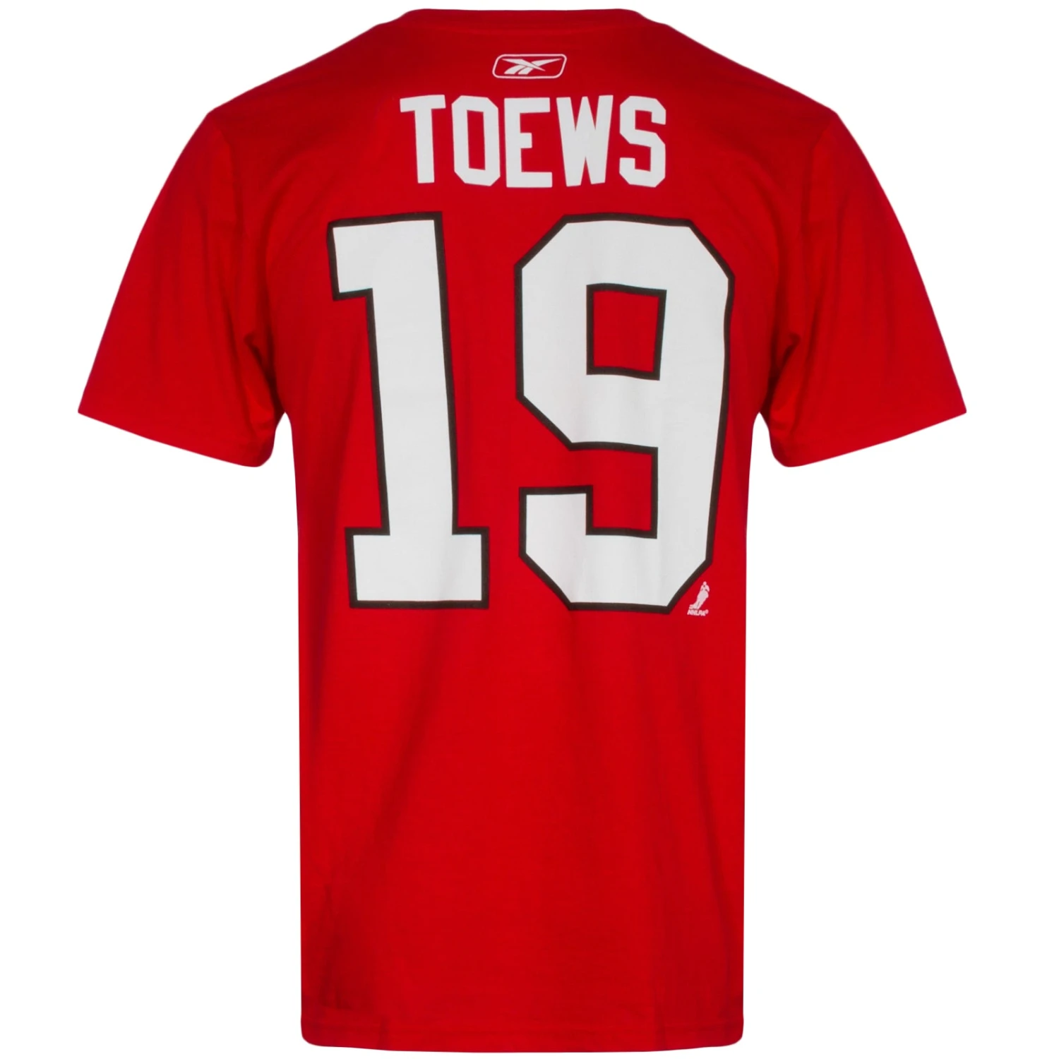 Get ready to cheer the Blackhawks to victory while cheering on the team’s steadfast Captain Serious in this red Jonathan Toews player tee. This tee shirt boasts the Chicago Blackhawks Indian head logo screen-printed in full-color across the chest along with the white and black Captain’s “C” screen-printed over the collarbone. The back of the shirt is designed to look like the back of Toews’s jersey with his last name screen-printed in white block letters above his number, 19, which is printed in large white and black numbers. Get ready for the Blackhawks to add another Stanley Cup to their remarkable collection with this red Jonathan Toews player tee.