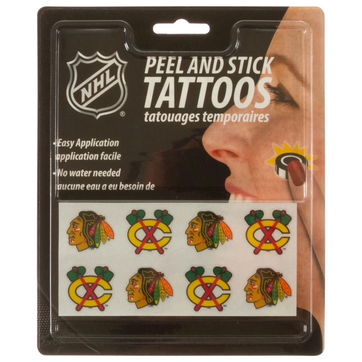 Complete your over-the-top superfan ensemble with these great peel and stick Blackhawks tattoos. These Chicago Blackhawks temporary peel-and-stick tattoos are fun for everyone. This set of tats comes with four full-color Indian head logos and four secondary tomahawk logos. These tattoos are easy to apply, do not require water, and are ready to go fresh out of the package. Show off your status as the biggest Chicago Blackhawks superfan with these great temporary tattoos.