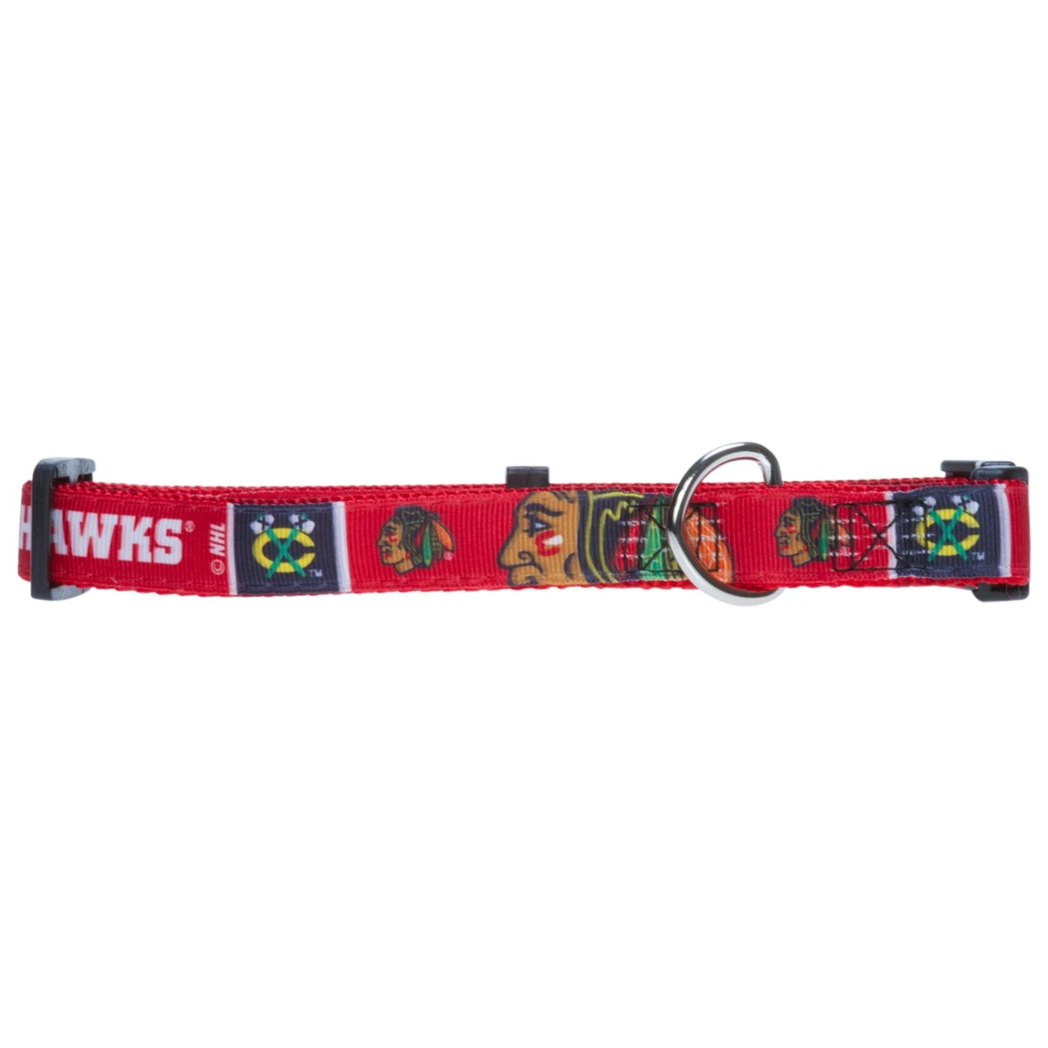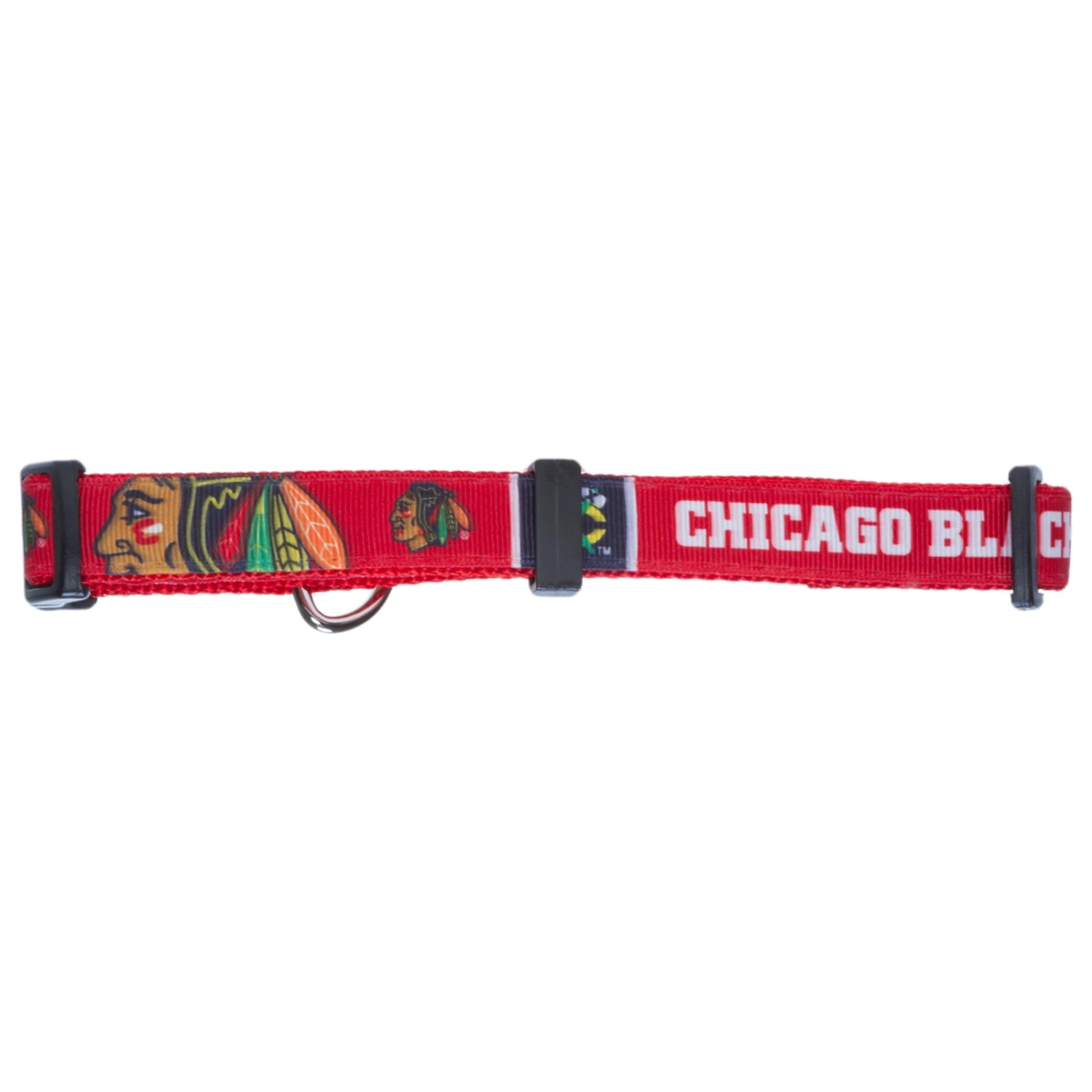 Get your best furry friend ready for another Chicago Stanley Cup championship in this Chicago Blackhawks dog collar. This red dog collar boasts repeating Chicago Blackhawks Indian head and tomahawks logos along with the “Chicago Blackhawks” white text logo. This collar sizes to fit your pooch comfortably to make sure they are sporting the best team in the world. Get ready for puck-drop at the Madhouse on the couch with your best furry pal with this Chicago Blackhawks dog collar.