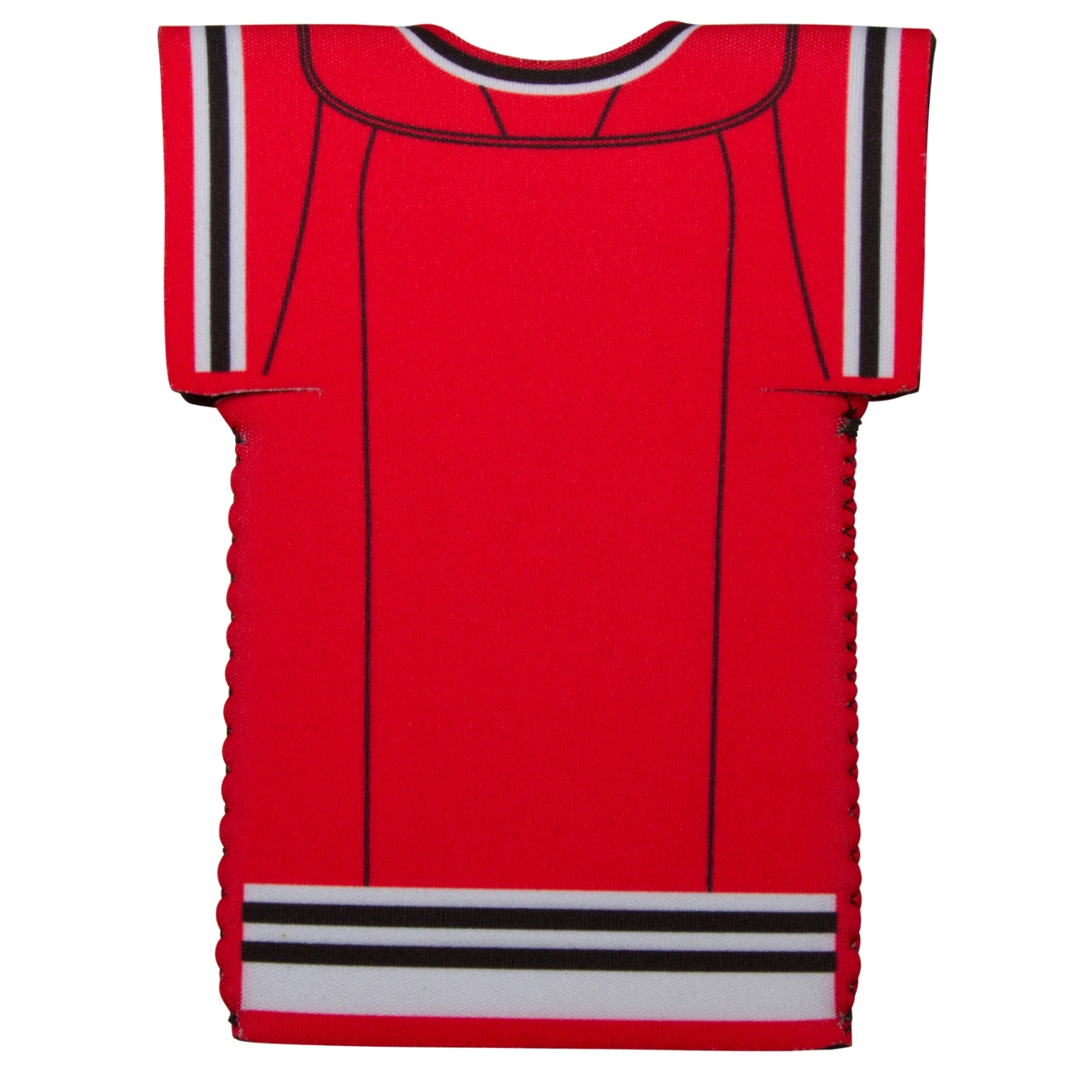 Give your beer bottle a bit of Chicago Blackhawks character and keep it cold with this red bottle koozie designed to look like a jersey. It features the team’s primary Indian head logo on the front as well as jersey style stripes. This koozie looks like it’s ready to get into the game as you throw a few back.Â