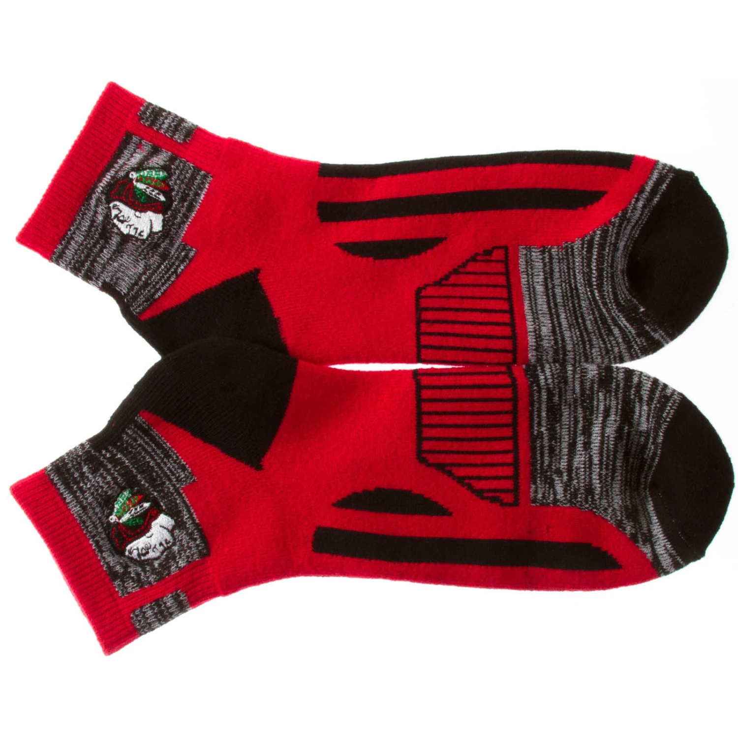 Sport your love of the Blackhawks on your feet with low ankle cuff socks. These red socks feature a black pattern on the top of the foot and black heels and toes. The ankle of the socks have a heathered black and white block with the Chicago Blackhawks primary Indian head logo embroidered in red, black, green, and white thread. These socks will complete your perfect Blackhawks ensemble when you are heading out to the Madhouse on Madison to watch the Blackhawks take down the competition as they charge through the competition.