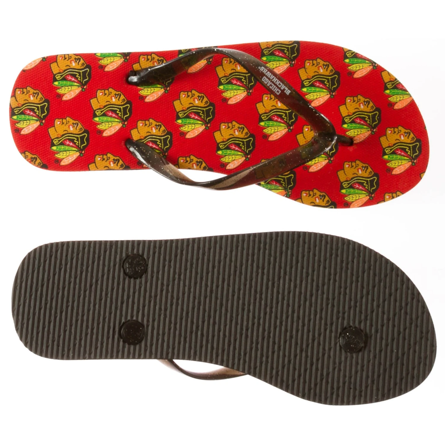 Get your summer style on point in these stylish Chicago Blackhawks flip flops. These red flip flops have a repeated Chicago Blackhawks primary Indian head logo pattern printed in full-color. The black plastic straps of the flip flops contain glitter and have the words “Chicago Blackhawks” printed on them in white. These sandals are a perfect compliment to your super fan ensemble when you are soaking up the sun.