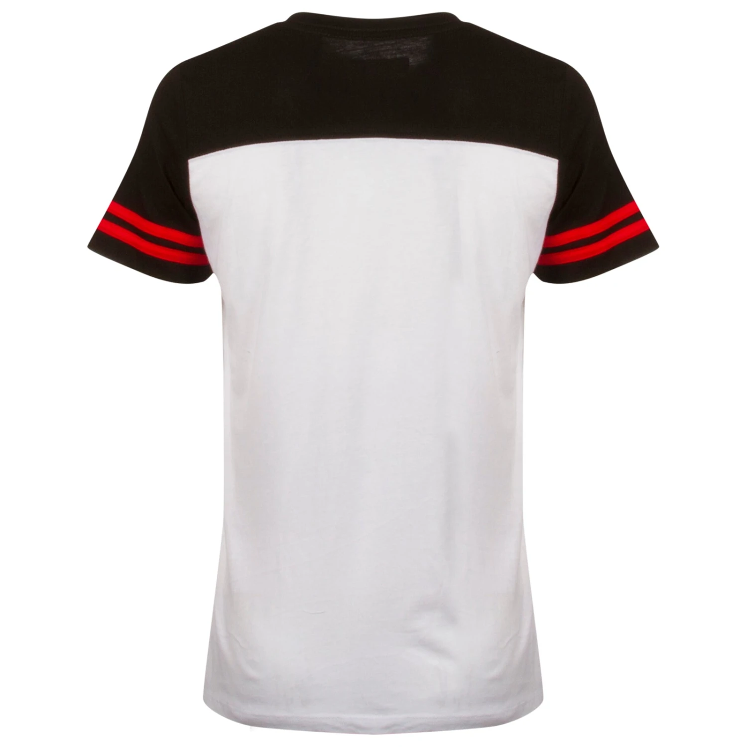 Get your little fan ready for a big game at the House That Jordan Built in this adorable Chicago Bulls tee. This tee has a white body, black shoulders, and black sleeves that are accented with red fabric stripes. A “Chicago Bulls” block text logo is screen-printed across the chest in glittering, floral pattern red letters and highlighted with a black screen-printed outline. The team’s iconic angry bull logo is digitally printed at the bottom of the design in red and black ink. This shirt is the perfect choice for your little one for a night of cheering Jimmy Butler and the rest of the Chicago Bulls to victory.