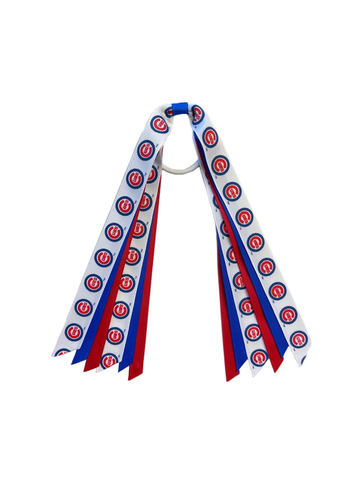 Show off your enthusiasm for the Chicago Cubs with this vibrant hair ribbon. This hair decoration has alternating white and pink ribbons, and the Chicago Cubs bullseye logo is printed repeatedly along the length of the white ribbon. These ribbons are attached to a white, elastic ponytail holder which will help keep your hair out of your face as you cheer the Cubs to victory. Complete your Wrigley-inspired ensemble with this unique Chicago Cubs hair ribbong.
