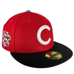 This uniquely designed Chicago Cubs fitted hat will be a stand out in any collector’s hat collection! The quality stitching stands out against the hat’s red and black colorway. The 1908 World Series patch is stitched on the right side of the hat while the back of the hat features a Cubs flag, different from the traditional batterman logo. Don’t forget to check out the contrast color brim in light blue!