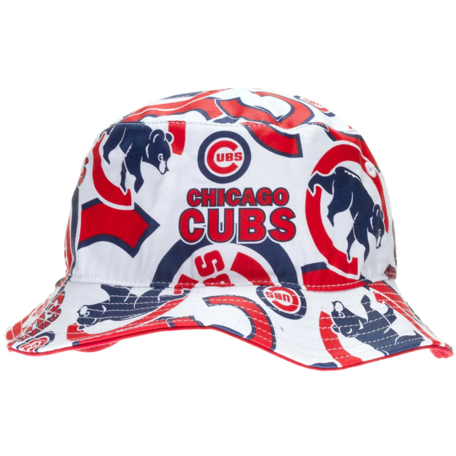 Get ready for a summer of soaking up the sun in the bleachers with this Chicago Cubs bucket hat. The sublimated print features the Cubs bullseye logo, the Cubs text logo, and the Cubs popular crawl bear logo in various sizes overlapping each other on the white bucket hat. This hat is perfect for keeping the sun out of your eyes while showing your dedication to the greatest team in professional baseball.Â
