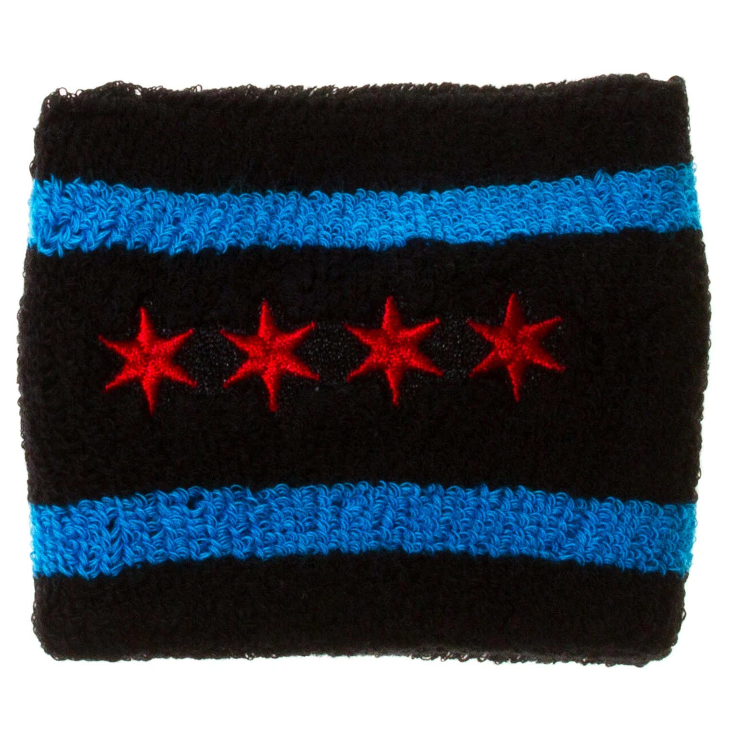Combat sweat with this exclusive black Chicago Flag wristband. This comfortable, elastic black wristband boasts two dyed blue stripes that wrap around the entire band. In the middle of these stripes are the four, embroidered, red six-pointed stars of the iconic Chicago flag. Keep sweat at bay and show your love for the Second City that’s second-to-none with this black Chicago flag wristband.
