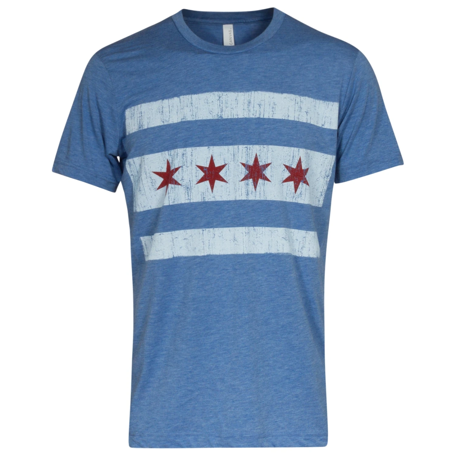 Celebrate the Second City that is second to none with this stylish Chicago flag tee. This soft, royal triblend tea boasts a large Chicago flag design distressed screen-printed in faded white and red ink. The heathered triblend tee and the cracked printing of the design combine to give the shirt a unique vintage look and feel that is perfect for your modern wardrobe. Show your love for the originality and style of Chicago with this exclusive Chicago flag tee.