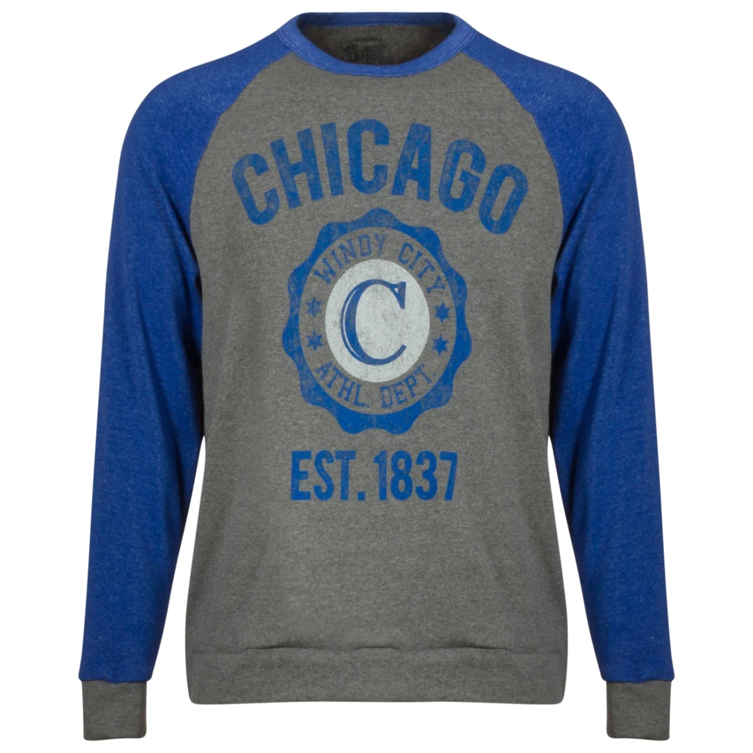 Keep warm through the cold months with great Windy City style in this Chicago-inspired crew neck sweatshirt. This crew neck grey sweatshirt has heather royal sleeves. The front of the shirt has a royal and white design with the word “Chicago” arched over a unique “Windy City Athl. Dept.” seal. The words “Est. 1837” is printed in blue at the bottom of the design. This sweatshirt is designed to be like an old, well-worn, comfortable sweatshirt you have owned for years. This is a classic sweatshirt is features timeless style and is certain to keep you warm.