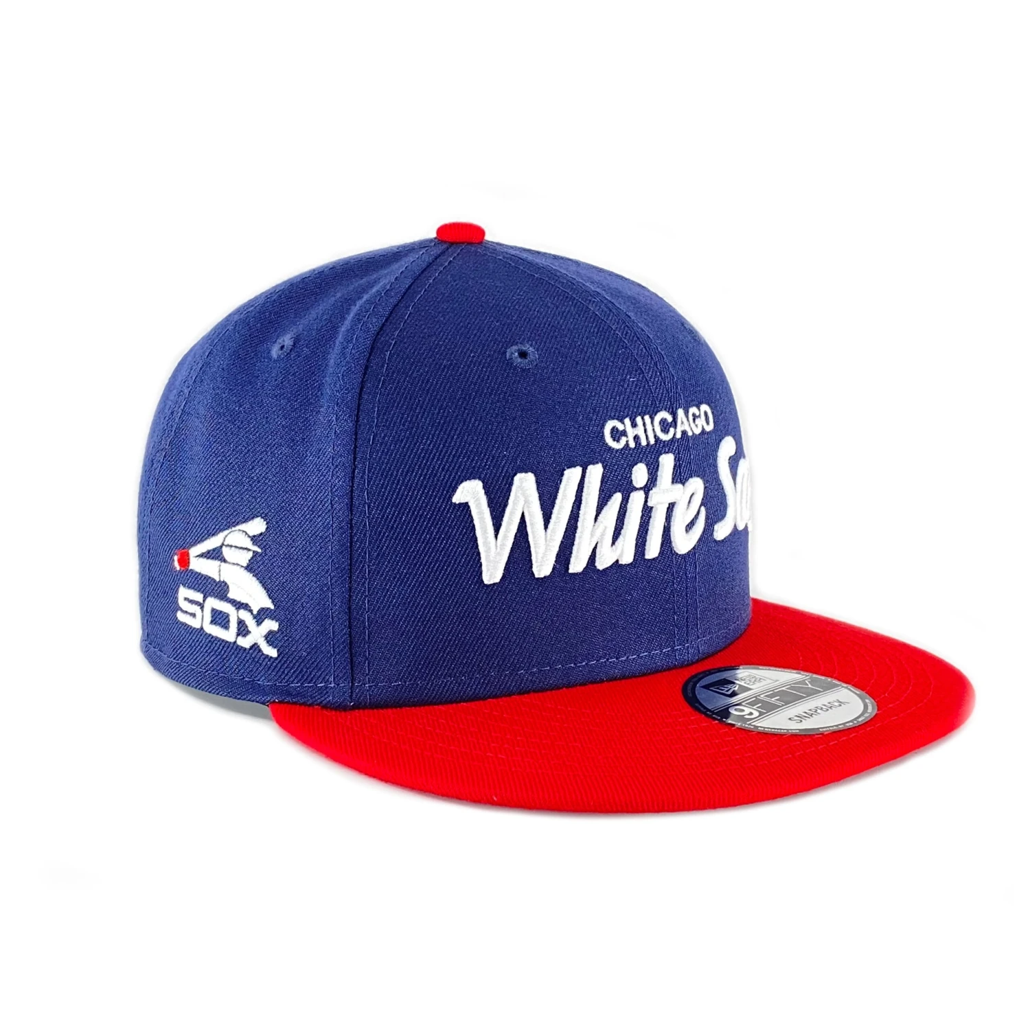 Whether you love the Chi Sox or just like cool hats, our White Sox Chase Script & Batterman Logo Snapback by New Era 9FIFTY is a must-have. The “Chicago White Sox” script writing across the crown really pops against the navy blue polyester fabric and bright red flat bill. New Era has added a throwback Batterman logo on the right side for good measure. Wear the Chase Script Chicago White Sox Truck Hat anywhere to show your appreciation for the South Siders.
