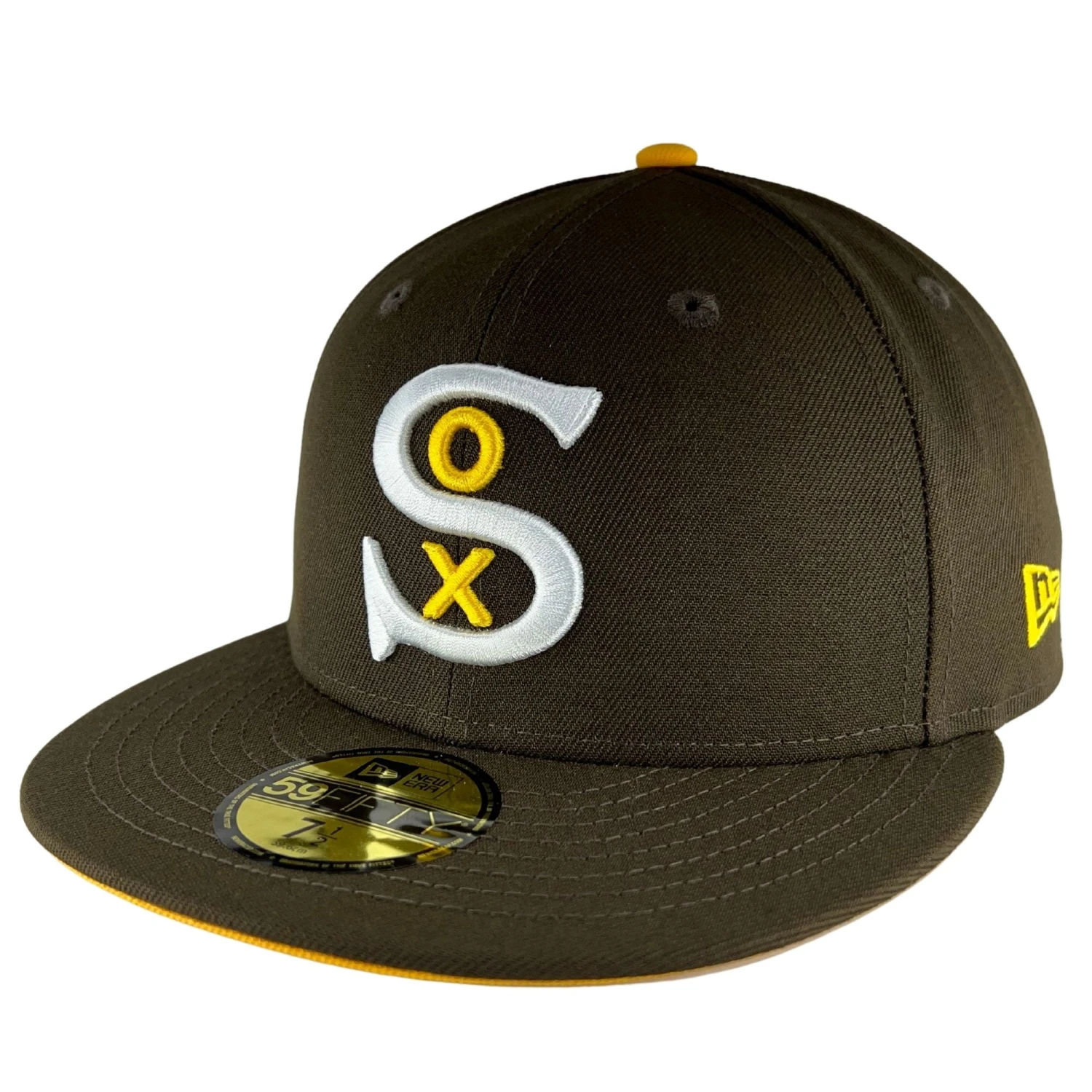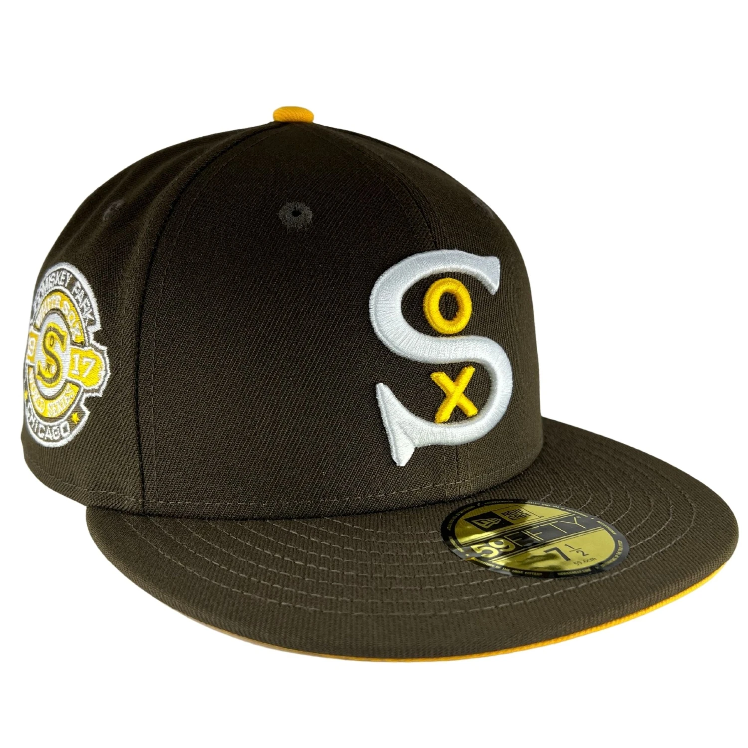 Uniquely designed in a brown and gold colorway, this Chicago White Sox New Era 59FIFTY fitted hat will catch the eye of anyone who’s looking! The logo is embroidered on the center of the hat. The patch on the side pays homage to the beloved Comiskey Park. You’re not going to want to miss out on this drop!