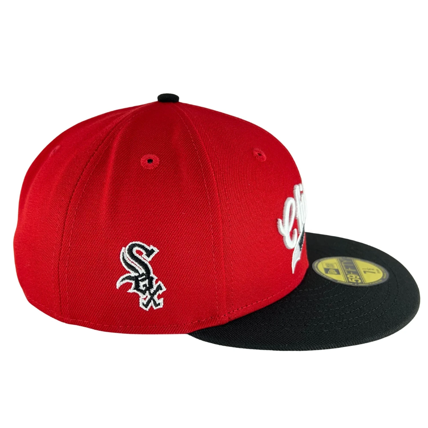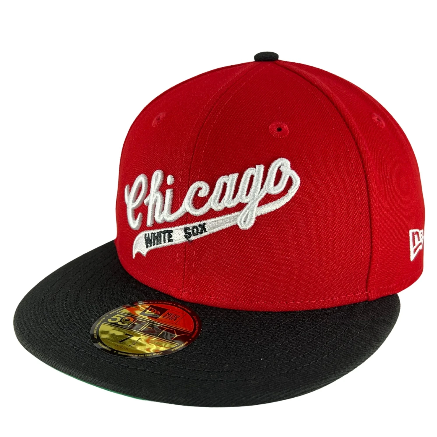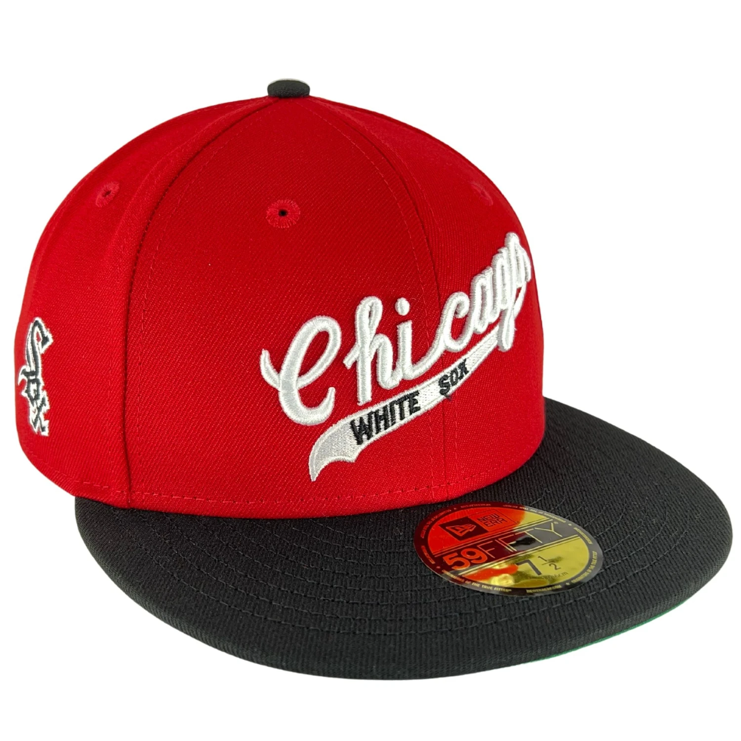 Part of our script Chicago 3-pack, this Chicago White Sox Red/Black/Green UV Script New Era 59FIFTY Fitted Hat will be sure to stand out in your collection! This uniquely designed cap showcases quality stitching throughout its design which stands out against the hat’s red and black colorway. The classic Chicago White Sox patch prominently stands out on the hat’s right side while the back of the hat features the traditional MLB batterman logo. Don’t forget to check out the hat’s contrast color undervisor in green! You’re going to want to add this to your collection. Only at Clark Street Sports.
