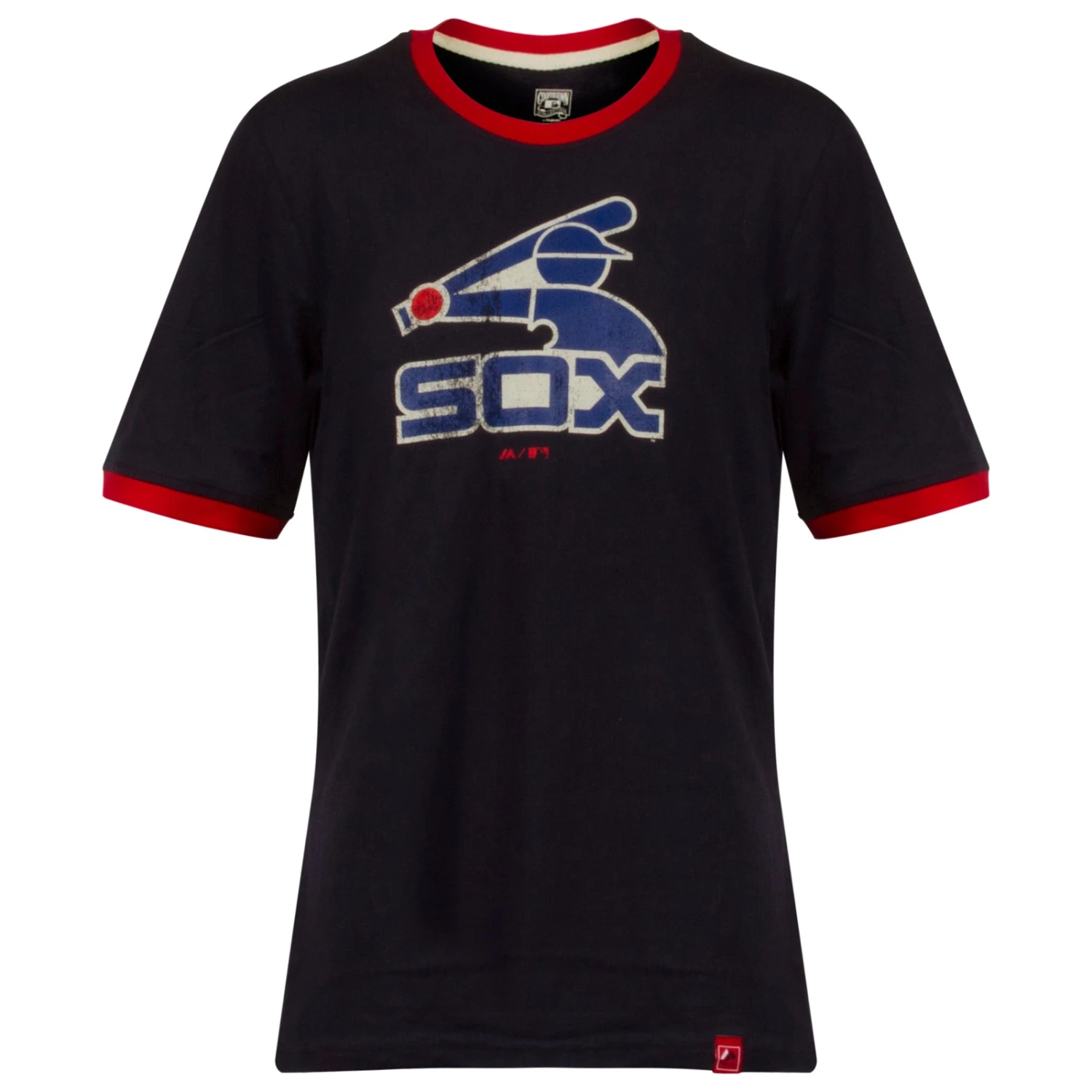 Get your little South Side fan decked out in retro-inspired Whtie Sox style in this ringer tee. Your little fan will look like they stepped out of a game at Comiskey in this navy tee with red ringers at the collar and sleeve cuffs. The team’s 1980’s batterman logo is printed on the front of the shirt in white, navy, and red ink. This vintage-inspired tee is perfect for your little fan who is embarking on a journey of a lifelong love of South Side baseball.Â