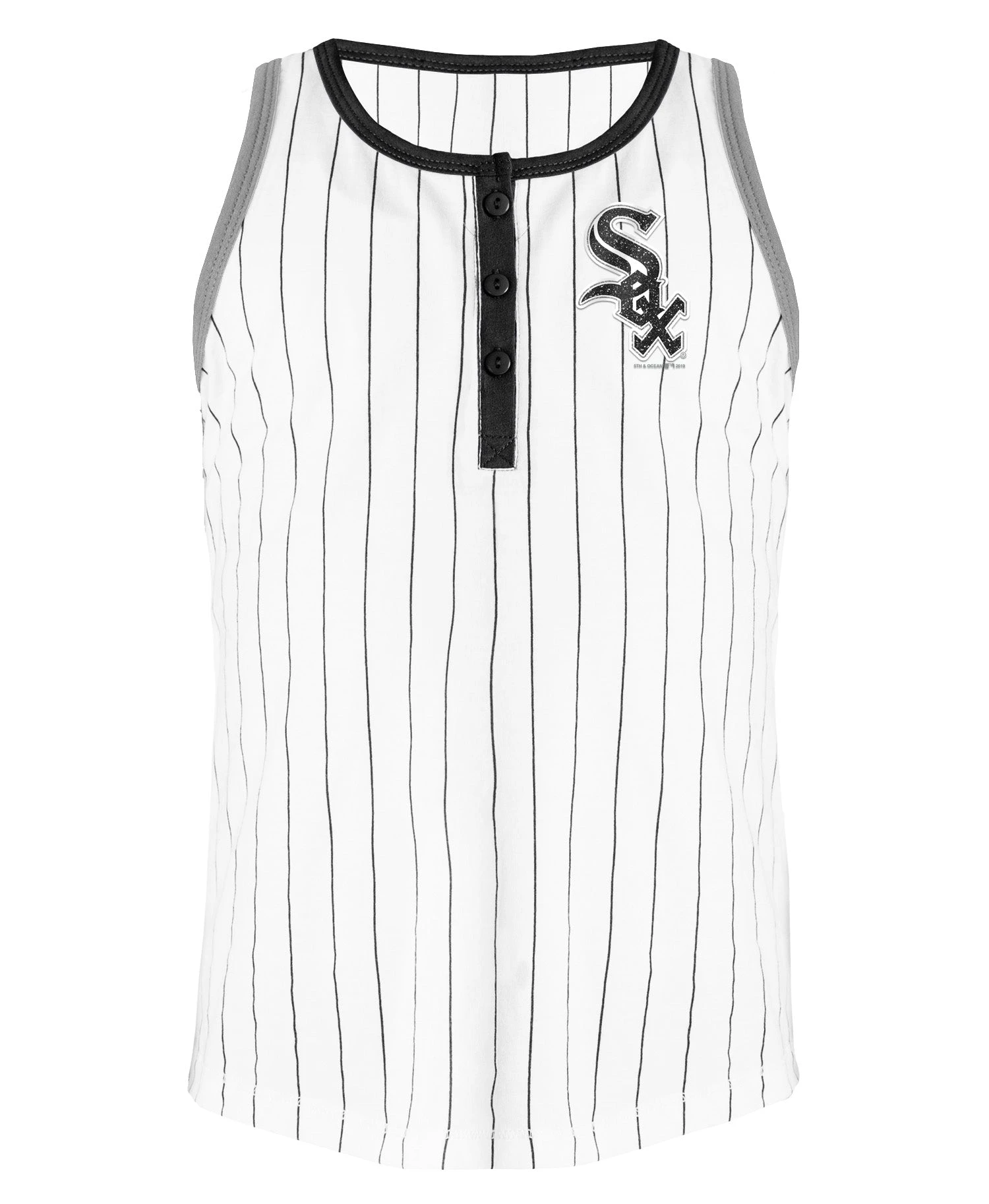 Chicago White Sox Youth Pinstripe Racer Back w Black Binding & Current Logo Tank by New Era. Features a screen print of “SOX” current logo screen printed on left chest. Black Pinstripes all around, three button closure on chest, black trim collar and grey trim on sleeve. Let your little one bring this baseball season in style with this Chicago White Sox Pinstripe Racer Back w/ black Binding & Current logo tank, so grab on today.