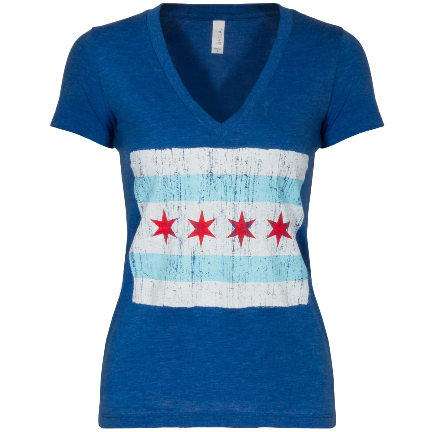 Show your love for the Second City that’s second to none with this unique Chicago flag tee-shirt. This soft, tri-blend royal v-neck tee boasts a distressed screen-printed design of the iconic Chicago flag printed across the chest in red, white, and sky blue ink. Keep cool while looking cool in this lightweight, comfortable, tri-blend Chicago flag v-neck tee.