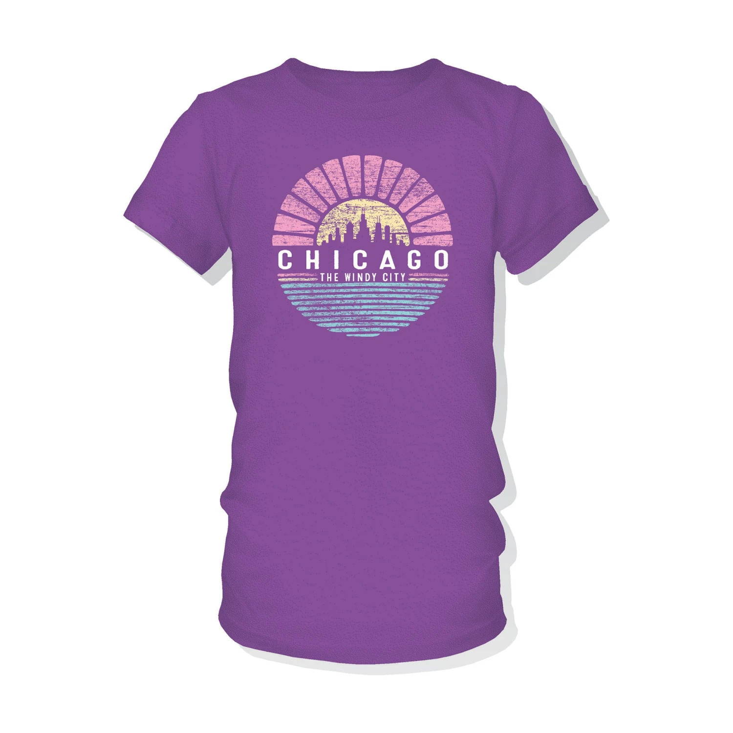 Chicago Youth Purple Dawn Tee by out of Hand. Let your little one show off their Windy City pride in this Chicago youth shirt. This shirt features “Chicago the Windy City” and Chicago “Skyline with Sunset” printed on center chest in pink, yellow and blue. When you and your little are taking in a sight at Navy Pier, Museum Campus, the Willis Tower, or the Hancock Observatory, show your dedication to the best city wearing this Chicago Youth Purple Dawn Tee !