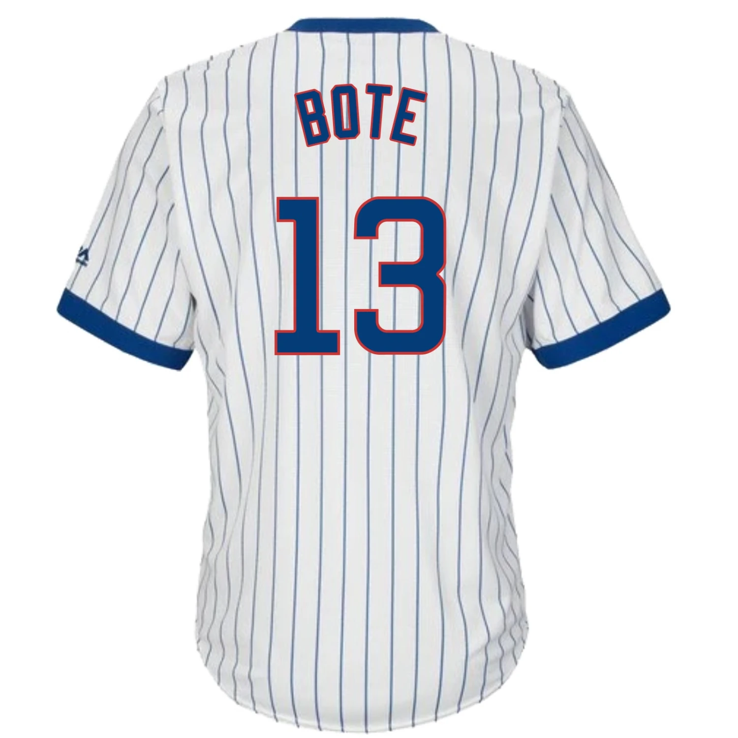 GET GAME DAY READY with this Chicago Cubs David Bote #13 Cooperstown pinstripe jersey! Channel your inner baseball players with this Cooperstown jersey. Featuring “BOTE 13” on the back and the Chicago Cubs Bullseye logo on the left chest, you’ll be sure to score a home run in this jersey! This is a cool base jersey.