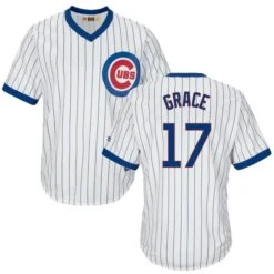 GET GAME DAY READY with this Chicago Cubs Mark Grace #17 Cooperstown pinstripe jersey! Channel your inner baseball players with this Cooperstown jersey. Featuring “GRACE 17” on the back and the Chicago Cubs Bullseye logo on the left chest, you’ll be sure to score a home run in this jersey! This is a cool base jersey.