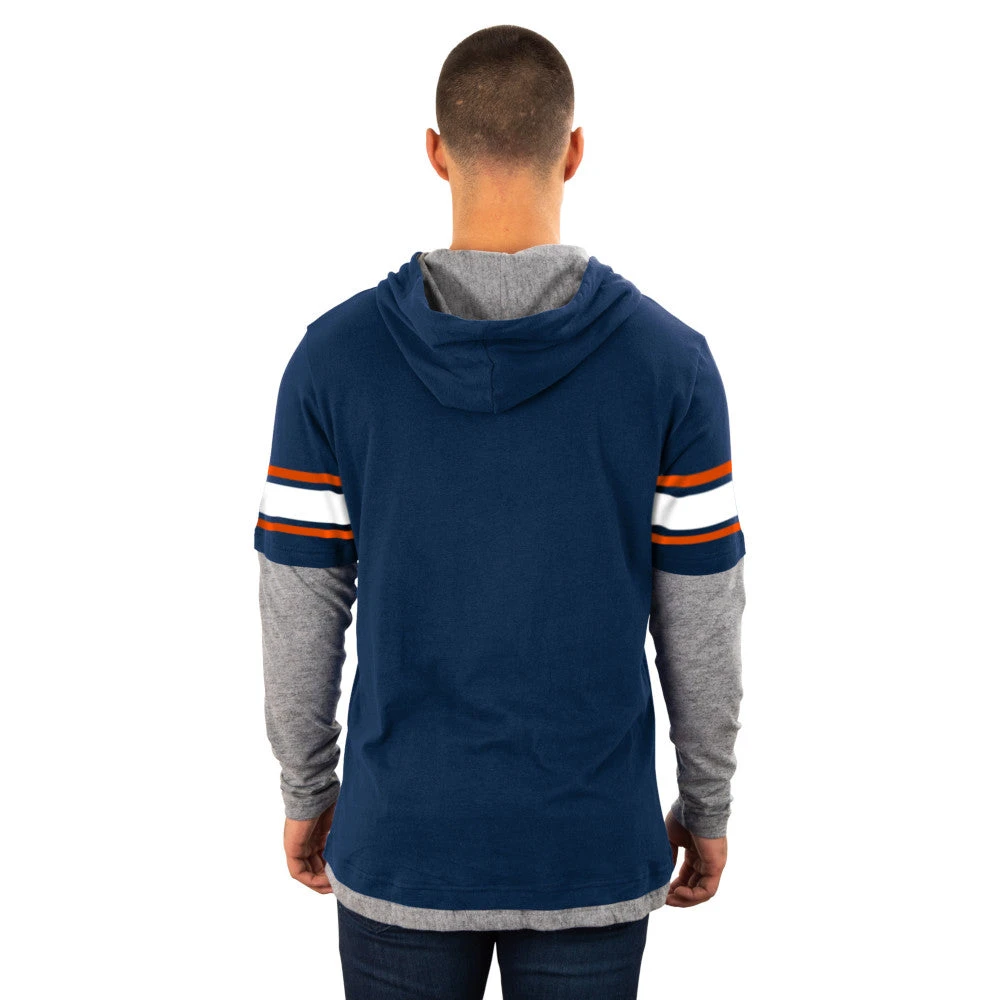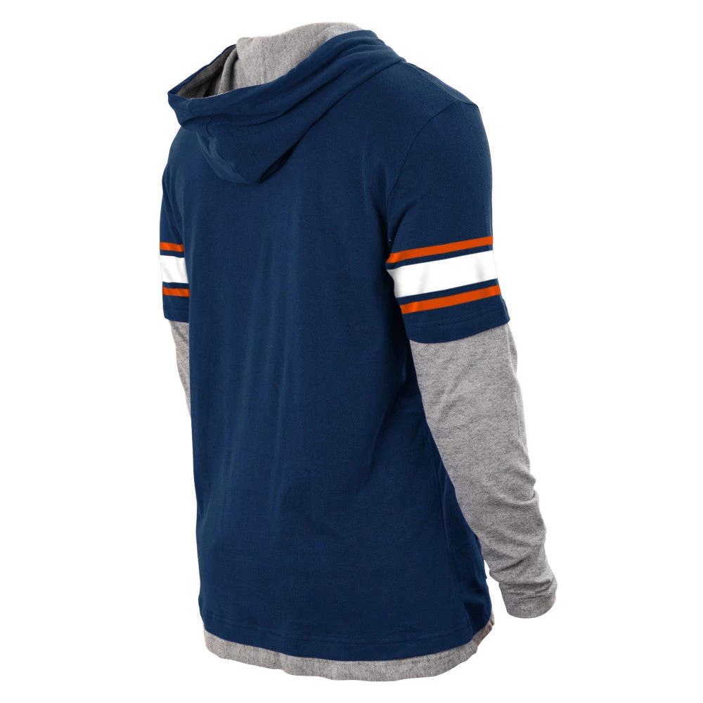 Get ready to watch the Bears touchdown to victory in this Chicago Bears Double Layered Striped Sleeve Hoody. The angry bear logo is largely on the front of the chest. Along with matching team color stripes on the sleeves.