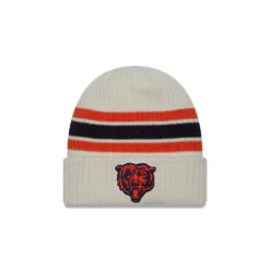 Bundle up in style and show off your Chicago Bears pride with our Vintage White OTC Stripes Logo Knit Hat! Featuring sand colored and orange stripes accented with the iconic angry bear logo on the cuff, this hat is the perfect combination of retro charm and team spirit. Elevate your game day look and stay warm all season long. Go Bears!