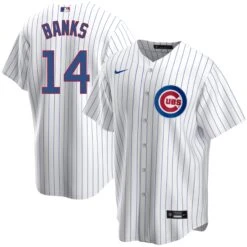 GET GAME DAY READY with this Chicago Cubs Ernie Banks #14 home jersey! Channel your inner hall-of-famer with this replica pinstripe jersey. Featuring “BANKS 14” on the back and the Chicago Cubs Bullseye logo on the left chest, you’ll be sure to score a home run in this jersey!