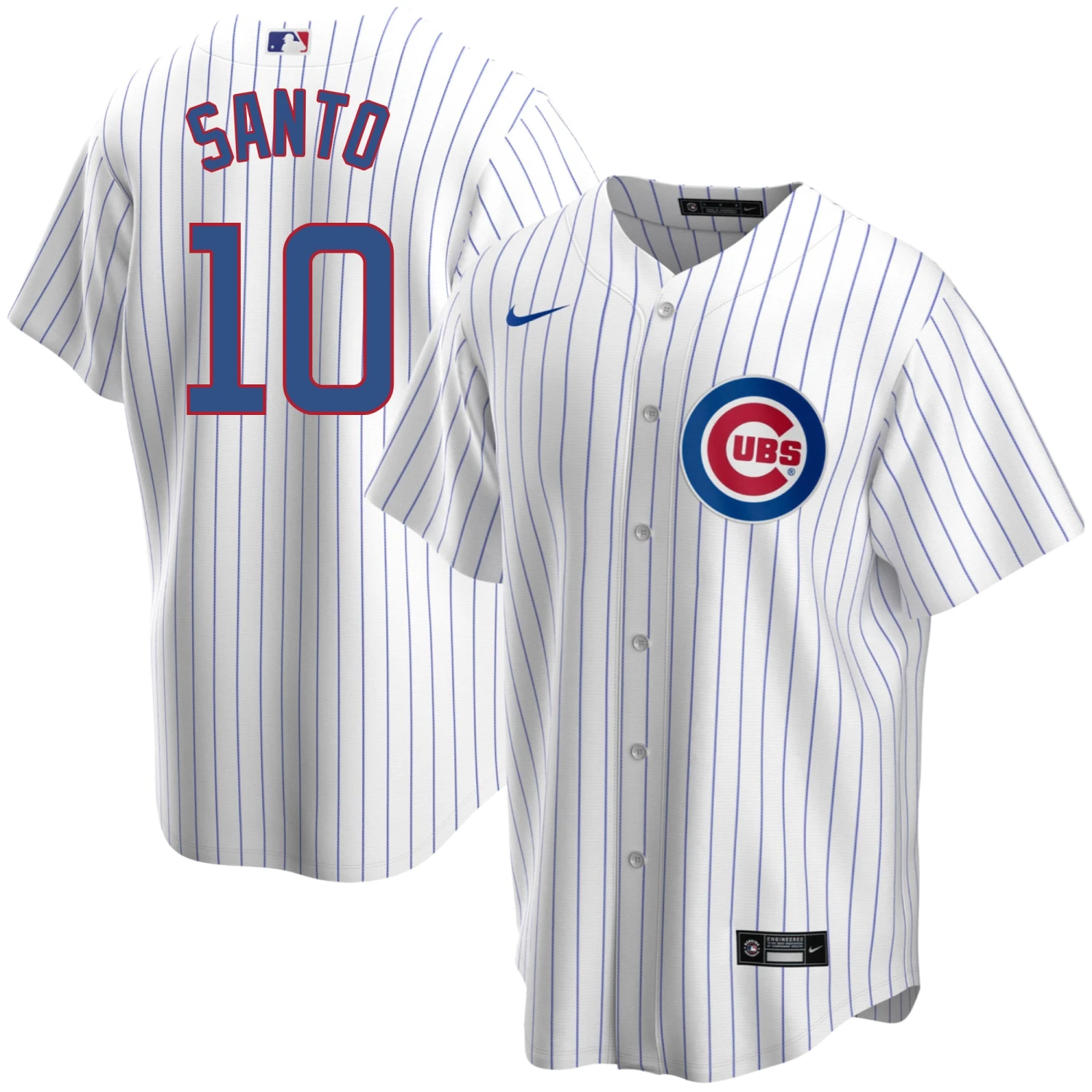 GET GAME DAY READY with this Chicago Cubs Ron Santo #10 home jersey! Channel your inner hall-of-famer with this replica pinstripe jersey. Featuring “SANTO 10” on the back and the Chicago Cubs Bullseye logo on the left chest, you’ll be sure to score a home run in this jersey!