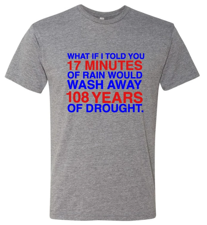 Lifelong Cubs fans can celebrate for all eternity in this What if I Told You Chicago Cubs T-Shirt. Across this front of the heathered gray blended fabric is a sentence remembering Game 7 in 2016: “What if I told you 17 minutes of rain would wash away 108 years of drought.” It’s printed in Cubs blue and red in honor of the greatest baseball game ever played. We suggest ordering one size up for this officially licensed shirt from Clark Street Sports.